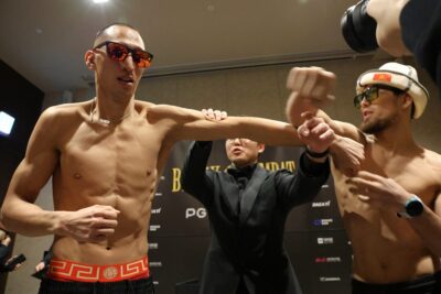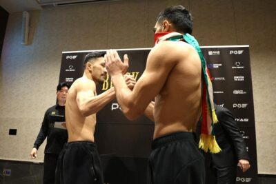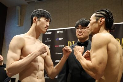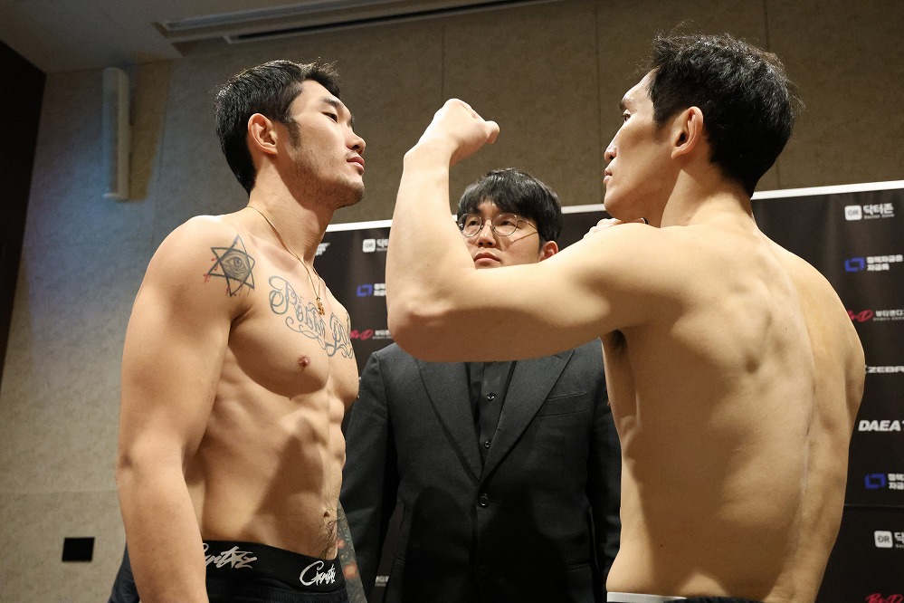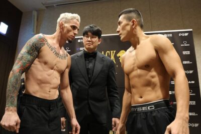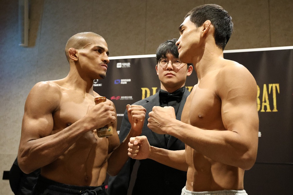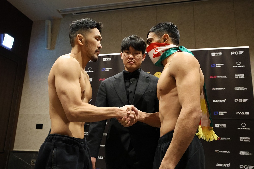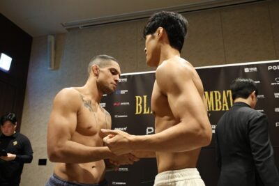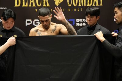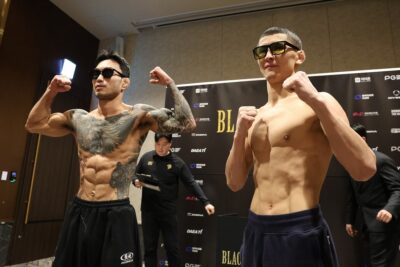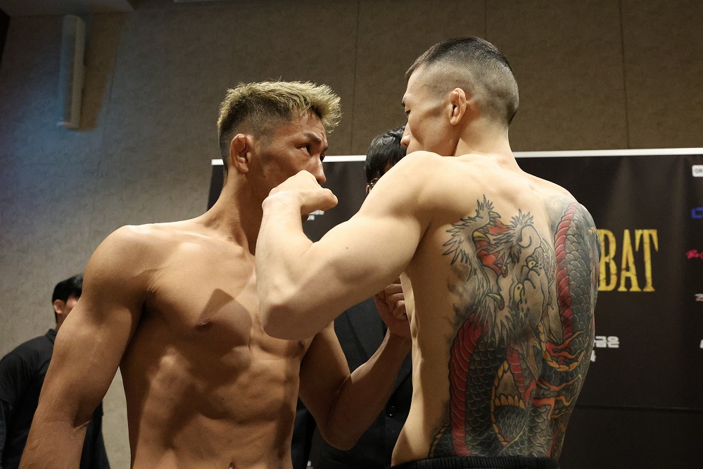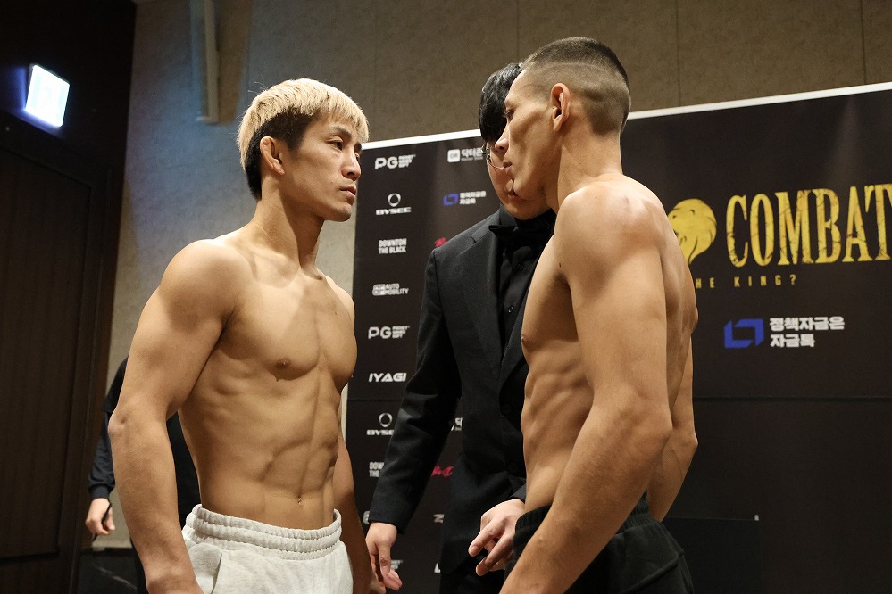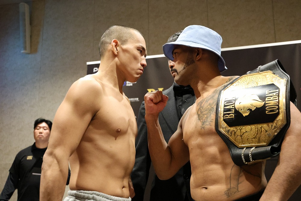 またBlack Combatバンタム級王者キム・ジェウンに挑戦する竹中大地は61.2キロ、Black Combatフライ級王座防衛戦をガブリエル・ホドリゲス相手に戦う駒杵嵩大は56.5キロでパスし、両者の対戦相手も同じ体重で計量を終えている。