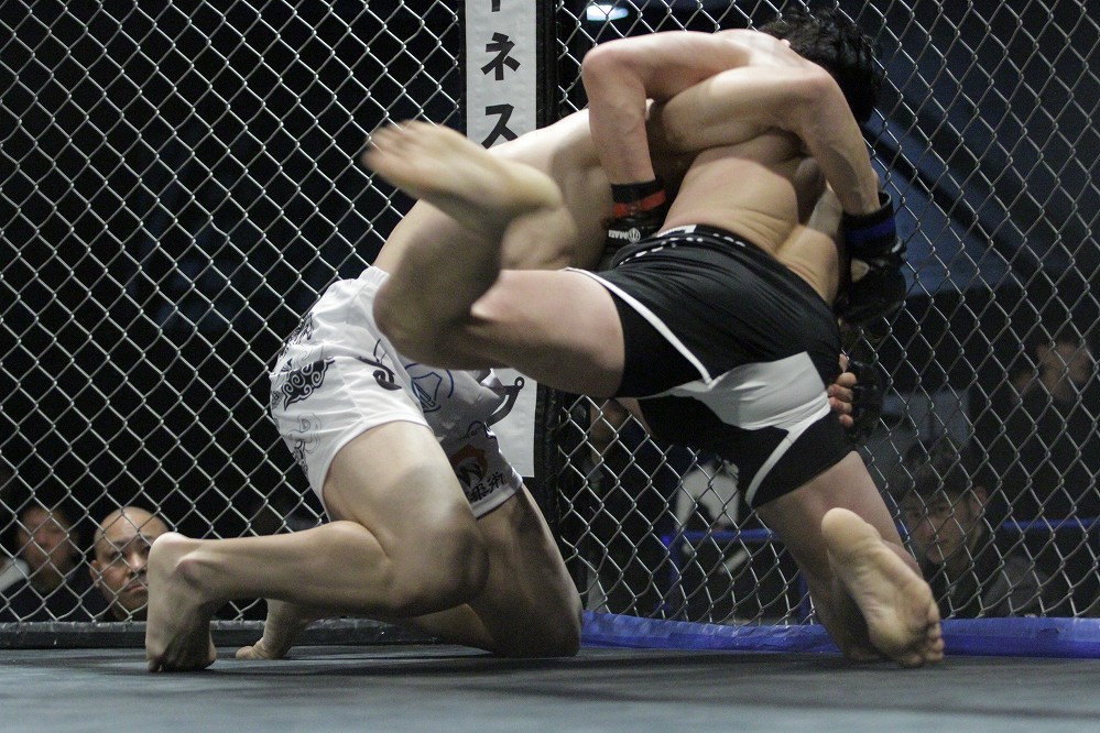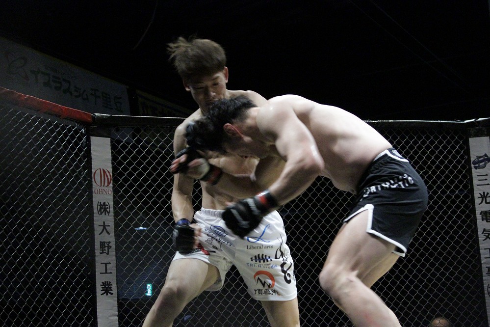 続くカーフにテイクダウンを合わされた松本が、下になるが首を抱えて後方に返してトップへ。そのままがぶって片ヒザの丸山は右を差してレッスルアップへ。アンクルピックで尻餅をつかされた松本は、頭も抜かれヒジを受ける。ここから立ち上がった丸山が、ケージに松本を詰めた状態で初回が終わった。