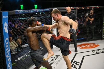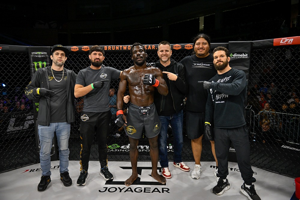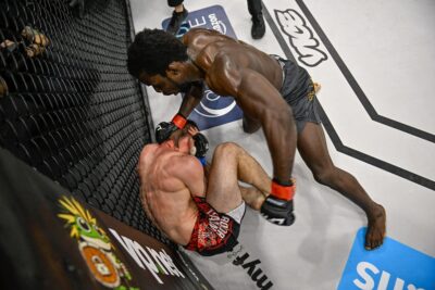 3R、左を見せて距離を詰めたサンダースが左フックでダウンを奪う。亀で動きが止まったキオッシのワキ腹にヒザを連続で蹴り込んだサンダースは、一度はパンチに切り替えたが再度ヒザ蹴りへ。動かないキオッシを見て、レフェリーが試合をストップ。36歳のベテランが、ロシアからアルバカーキに移り住みジャクソン・ウィンクルジョンMMAで最高峰を目指すロシアンの夢を砕いた。
