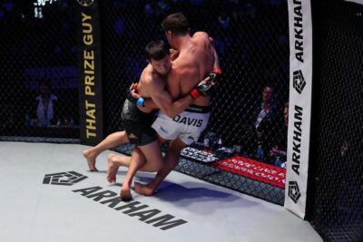 さらにウスマンは右ヒジを滑らせるが、膠着誘発のガードワークにブレイクが入った。デイヴィスはここで右をヒットさせ、前に出てくるウスマンの蹴りに左に回る。ワンツー&左ハイが空振りになったデイヴィスは、フックにダブルレッグを合わされると、シングルからアームドラッグ気味の動きでバックを譲る。残り30秒、背中を伸ばしたウスマンが、肩固め狙いから背中の乗ったままでシートベルト&RNC、ルオトロチンでデイヴィスを落とした。