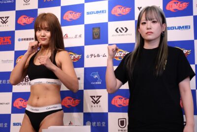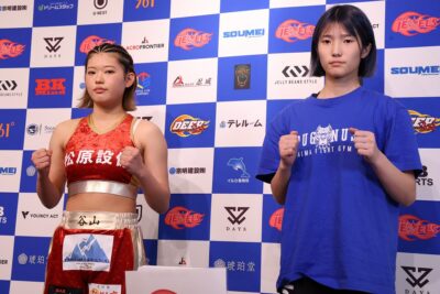 他方コメント後にマイクを位置に戻し相手選手との距離が離れたなかで、目礼を送ったのが竹林エル×海咲イルカ、キックの坂本瑠華×ダイナマイト♡ユラ、アマの山吹マリン×村井成美という3試合で戦う6名。そして対戦相手とステージを下りる際の挨拶のような形で一礼を見せていたのが、あきぴ&たからの2人だった。
