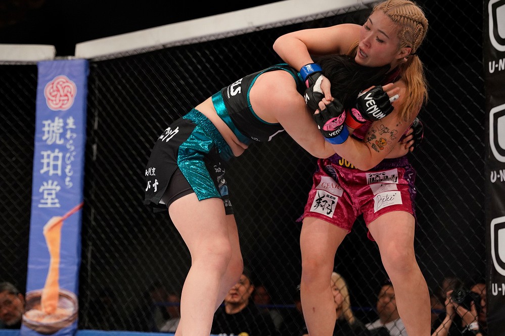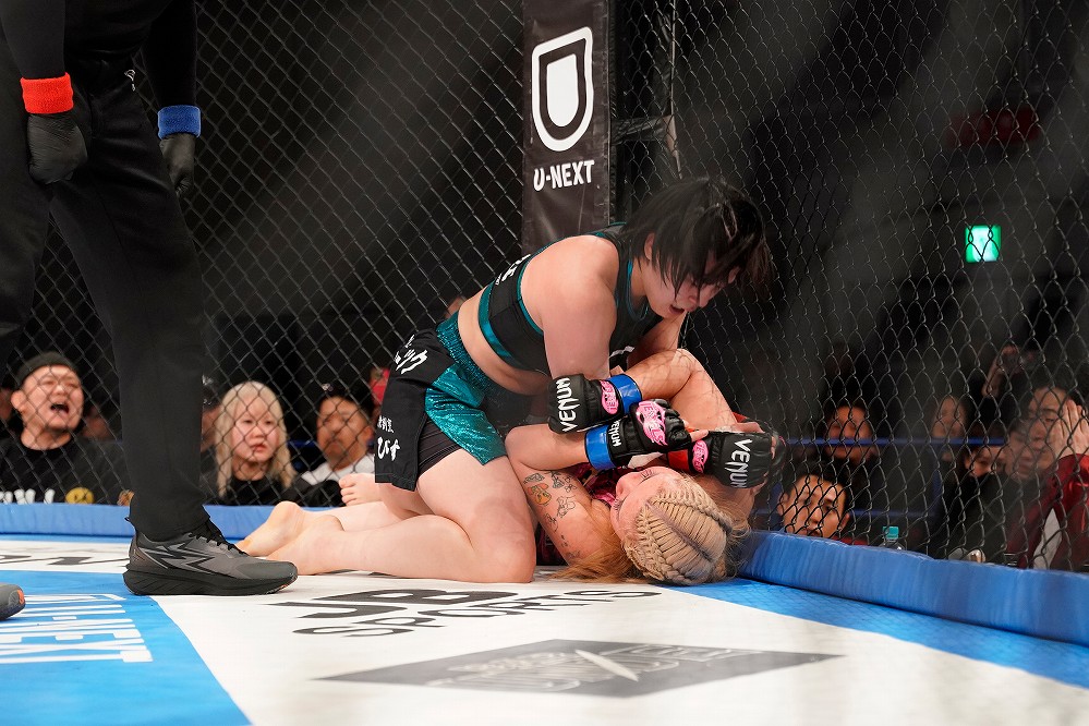 2R、樹季が一気に距離を詰めるが、やはり百湖がケージ際の攻防を制する。ニータップからバックに回る百湖。樹季が正対したが、百湖は再びバックに回って崩していく。離れたい樹季を逃がさずケージに押し込むと、百湖はウィザーで凌ぐ。得意の首投げ、あるいはキムラに持ち込めない樹季。百湖はバックから足を払い、トップを奪取してパウンドを落とす。ハーフガードの樹季の顔面にパウンドとヒジを連打すると、樹季の動きが止まり、レフェリーが試合を止めた。