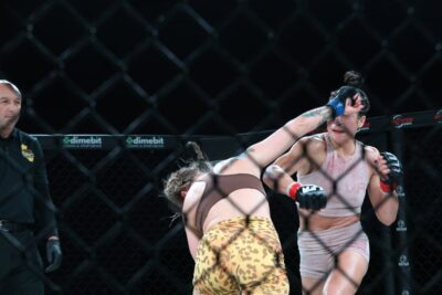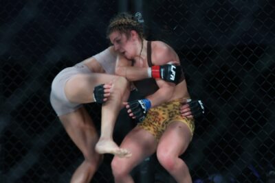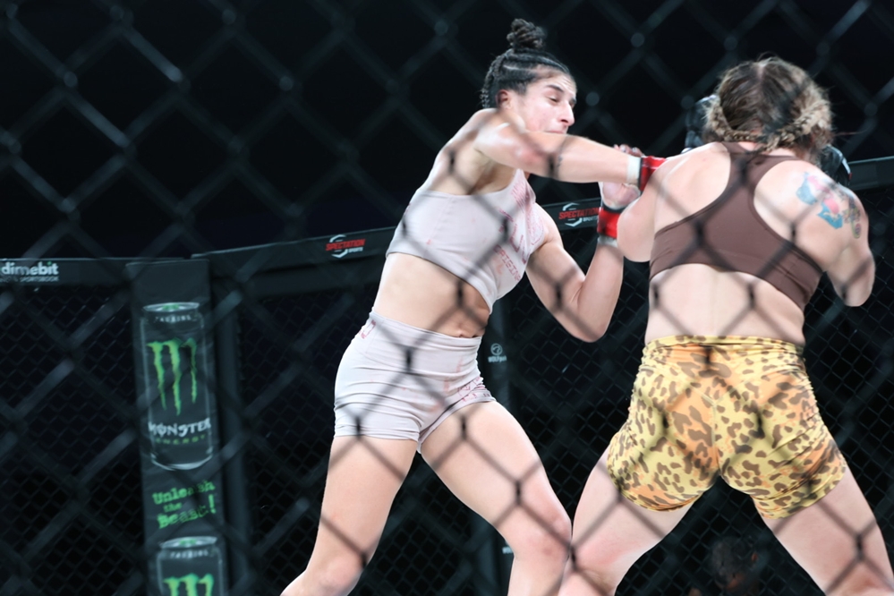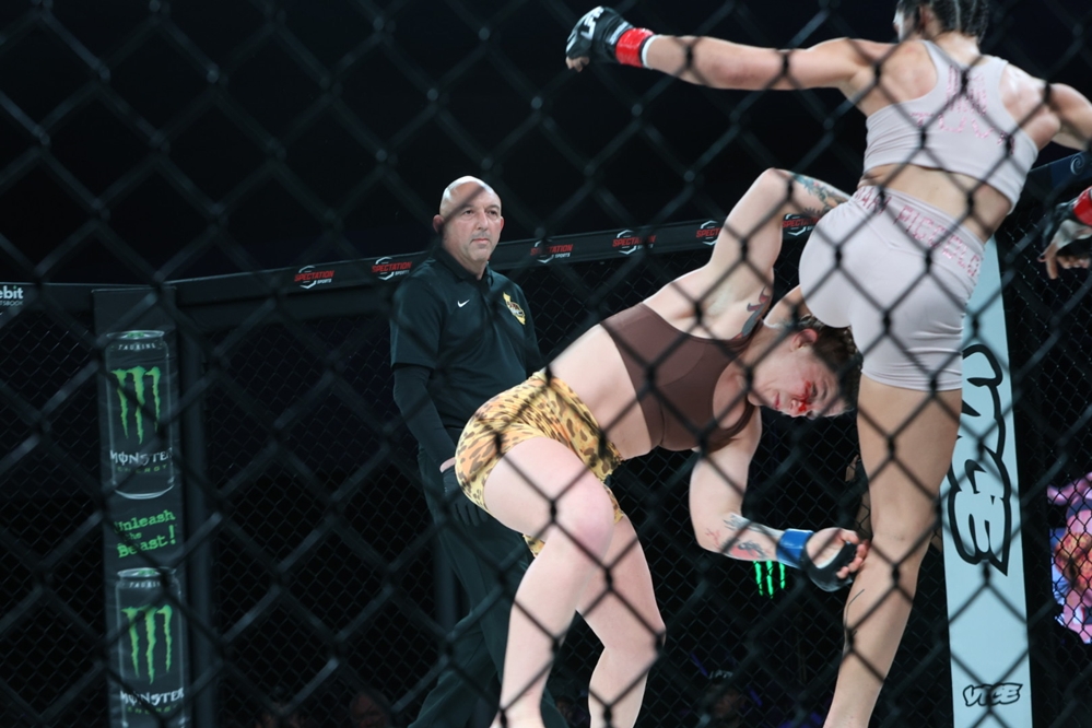 ノウィッキは全米女子レスリングの3度のオールアメリカンで、ミシガン州では6度の王者にもなった選手。高校生の時にはD2で、男子の州選手権の予選を通過したこともあるという。ピッコロが鋭いジャブを伸ばす。ノウィッキもジャブから前に出ようとするが、ピッコロが右ストレートを合わせる。ピッコロが足を使ってジャブと右カーフを蹴り、ノウィッキが細かいパンチからピッコロをケージに押し込む。ピッコロは首相撲の形を作って離れ、ノウィッキがすぐに組みつきピッコロの左足にシングルレッグに入る。ピッコロはそれを切りながらヒジを入れ、ノウィッキがダブルレッグに切り替える。