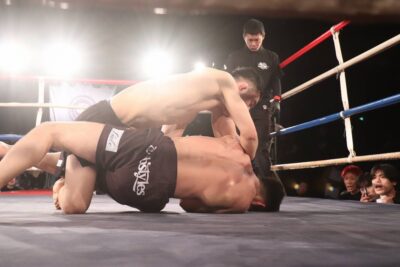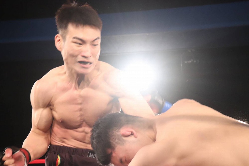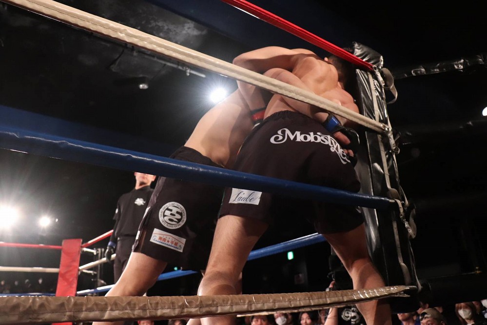 立ち上がった人見をヒザで削る藤田が、ロープを利用してバックに飛び乗る。スタンドに戻った人見は、右オーバーハンドから飛び込んでくる藤田の顔面に右ヒザを叩き込んだ。フラッシュダウンから再びテイクダウンを狙う藤田だが、倒し切ることはできなかった。