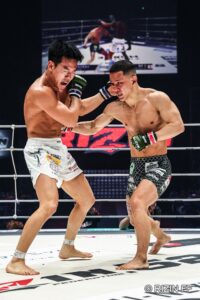 2R、新井が飛び出した。下がるイ・ジョンヒョンに対し、体を振って距離を詰めるが、イ・ジョンヒョンが組みついてコーナーまで押していく。しかし新井が切り返し、離れ際に右アッパーを突き上げる。イ・ジョンヒョンが左ヒジ。新井はボディを狙う。ショートレンジの打ち合いから新井がニータップを狙うも、イ・ジョンヒョンが右腕を差し上げてコーナーまでドライブする。イ・ジョンヒョンは首相撲からヒザ蹴りへ。新井の目周辺に腫れが見える。