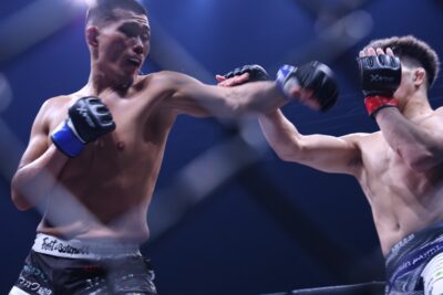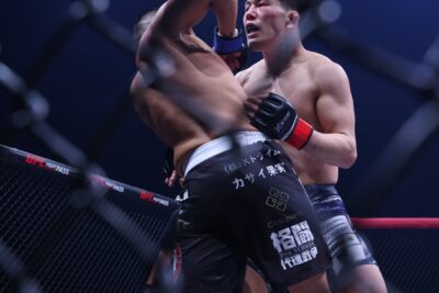 2R、葛西が前に出て右ストレート。神谷も左ストレートから右フック、葛西が右ストレートを当てる。神谷は細かいパンチで前に出てシングルレッグへ。そのままボディロックで葛西をケージに押し込む。葛西は右腕を差し返してテイクダウンを仕掛け、神谷のバックに回ってRNCへ。ここは神谷もバックコントロールを許さず、逆に葛西から上を取ってバックに回る。葛西は足をフックさせずに立ち上がり、正対して離れる。