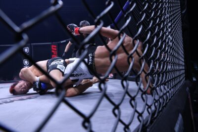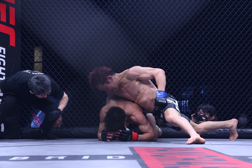 大塚が体を上下させてステップする。猿飛流もステップしながら前手のフックを出し、大塚はインカーフを蹴る。大塚がジャブとインカーフ、細かいフェイントで前に出る。猿飛流がダブルレッグに入り、左腕を差して大塚をケージに押し込む。ここで猿飛流が自分の後方に投げる形でテイクダウンし、ケージに移動しようとする大塚を寝かせて、大塚の左サイドにパスガードする。大塚も右腕を差して体を起こそうとするが、それに合わせて猿飛流がマウントポジションに移行する。