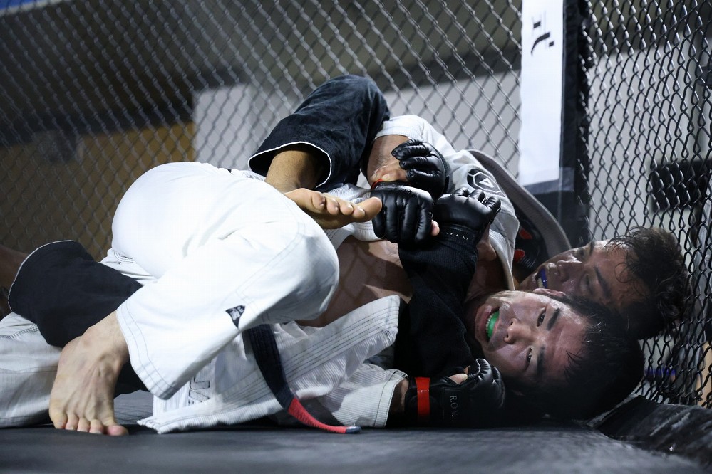 これは極めることができずも、マウントをキープ。竹本がブリッジで返そうとしたところで、しっかりとマウントを整えた。ハーフに戻す竹本だが、右腕を差し上げられている。竹本も右腕を差し上げ、メネギンのラペラを掴み、足は二重絡みに。動きが止まり、レフェリーがブレイクをかけた。