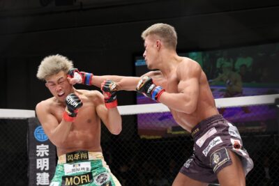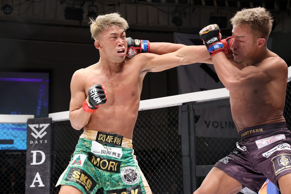 2R、サウスポーの力也が左ミドル、右ジャブを突く。関原は両ガードを下げて右ローを放つ。力也は右ジャブ、左ストレート。関原の右フックは届かず。ガードを固め、体を振りながら左右フックを放つ関原がテイクダウンを狙うも、差し返した力也がヒザの削り合いから左の小内刈りで尻もちを着かせた。関原がすぐに立ち上がると、力也も距離を取って右ジャブを伸ばす。関原は左右フックから、差し合いでバックを奪う。