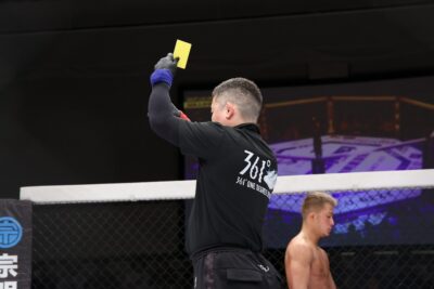 最終回、力也の右ジャブが関原の顔面を捉える。関原も左右フックを返す。力也は左インロー。ノーガードで咆哮する関原がダブルレッグを狙うも、力也がガブった。関原がケージまで下がると、力也は左腕を差し上げ、右腕は首に回す。1Rと同様にネルソンで固めたが、ここで関原の顔面にヒザ蹴りを打ち込んでしまう。反則行為のため試合は中断され、関原に休憩が与えられる。力也にイエローカードが提示され、試合再開に。