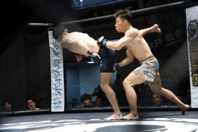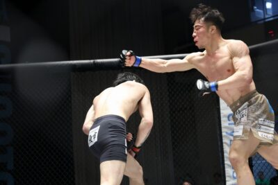 関口が開始早々突っ込んでくると、中村が右跳びヒザで迎え撃った。左に回って距離を取る中村。右オーバーハンドを振るって左へ。フェイントの掛け合いから、関口が右スピニングバックキックを見せた。ガードを下げて構える中村は、関口のローをかわして右ローを打つ。ケージ中央で両者の右オーバーハンドが交錯。関口が飛び込むと、中村が右を合わせて腰を落とさせる。