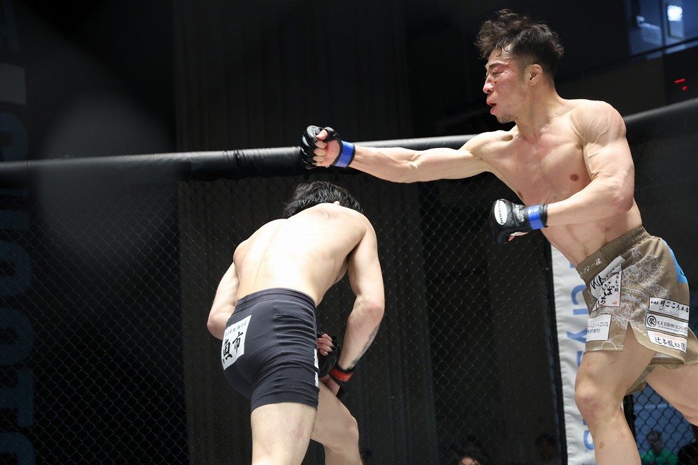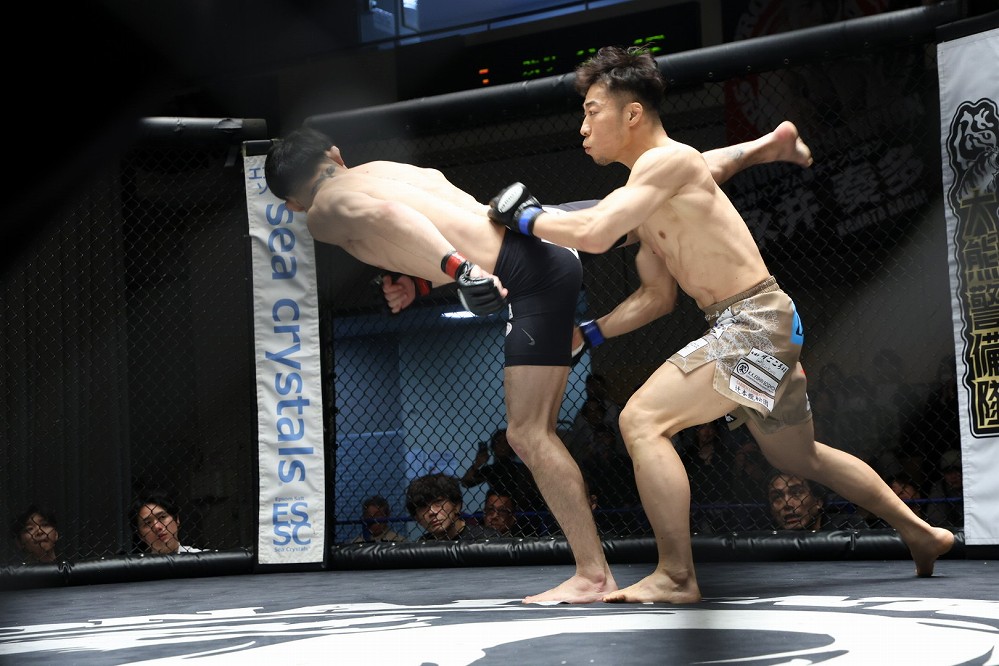 ケージ中央で、関口のニータップに中村が右アッパーを合わせる。左に回って距離を取る中村にケージを背負わせる関口。関口の右スピニングバックフィストに右を合わせ、さらに距離を詰めてくる相手に中村が左を合わせていく。右の打ち合いから、テイクダウンを切った中村の蹴りが反則のサッカーボールキックになりかけたが、ここで試合終了のホーンが鳴った。
