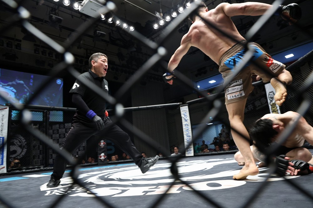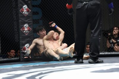 パウンド連打を受けてうつ伏せになった中村が立ち上がるも、関口がダブルレッグでグラウンドに引き戻す。ケージに背中を預ける中村。関口はバックに回りながらRNCを狙う。バックマウント→ボディトライアングルで固めた関口が、削り続けて幾度もRNCにチャレンジする。極められなかったものの、ダメージを与えてラウンドを終えた。