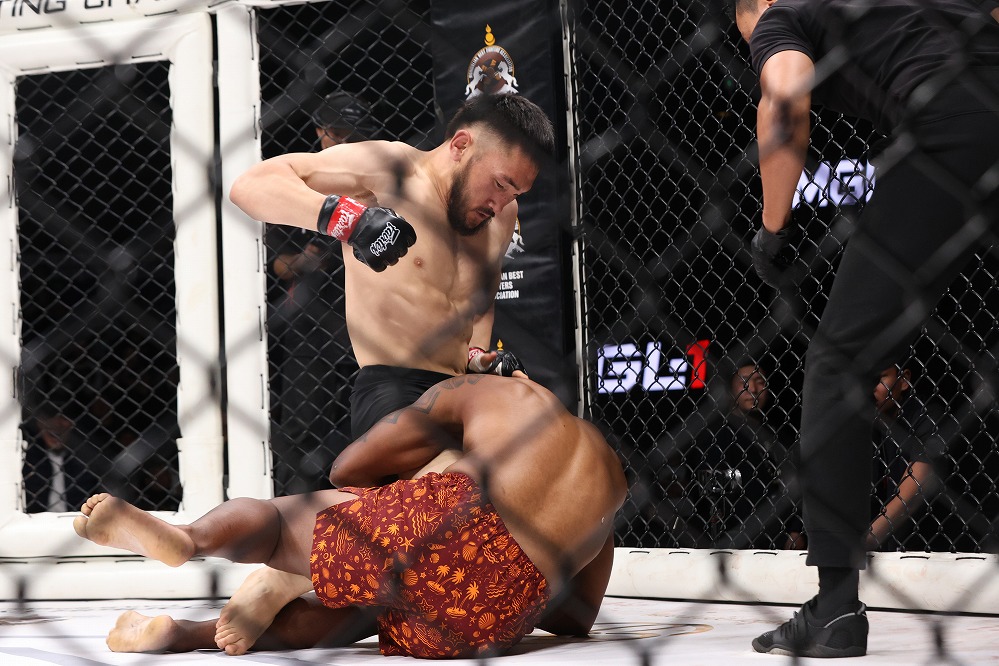 このケージ際の攻防で、攻めていた中原が体力を消耗した結果の打撃決着だった。一方、最近の青井はペース配分ができており、15分間戦い続けるなかで上手くテイクダウンを織り交ぜている。今回の試合が23戦目となる青井は、キャリア6戦から10戦前後のファイターが集まった日本勢のなかでもずば抜けて高い経験値を誇る。それは他の国のファイターも同様で若くて貯金が5、6とあり、フィニッシュ率も高い対戦相手に対し、その勢いの盲点をつくファイトができるのが、青井の強さだ。