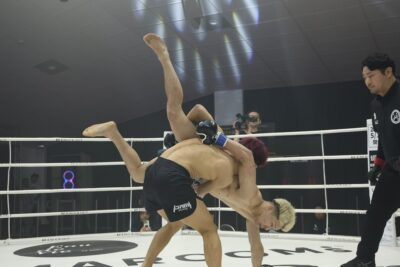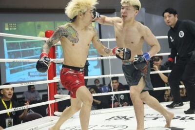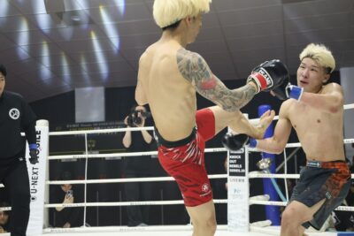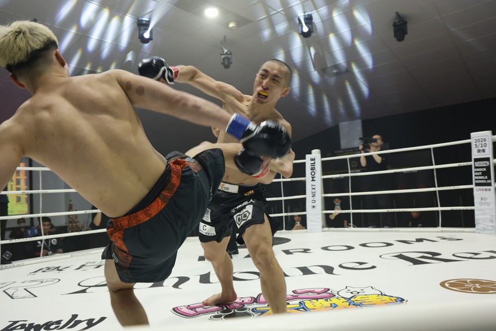 初戦は下田×石原。サウスポーの石原が左ミドル、左ハイと蹴りを散らすと、下田が右フックを返す。石原も右フックを打ち込む。距離を取る石原がキャッチからリフトアップし、さらにニータップも見せる。至近距離で右を打ち込んで組んだが、下田が投げた。試合終了直後、下田が首投げでテイクダウンを奪う。試合は判定に持ち込まれ、2-1で下田が勝利した。
