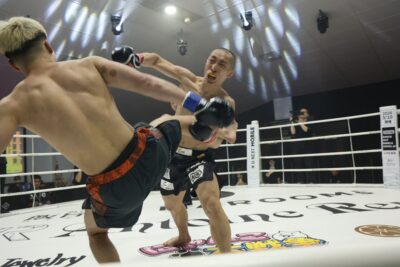 スタンドに戻ると左ロー、左ストレートを効かせる。下田の右を被弾するとテイクダウン&ヒザ蹴り凌ぐが、残り10秒で下田がラッシュを仕掛け、フラつかせて試合終了。判定は2-1で下田が勝利——なんと下田が3人抜きで、Battle-Boxチームが決勝に進出した。