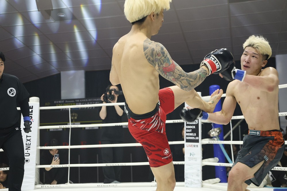 KNOCK OUT クロスポイントの大将、藁谷はサウスポー。左インロー、左ミドルから左ハイを効かせる。さらに距離を詰めてきた下田の顔面に左ストレートを見舞う藁谷。組むと小外掛けで倒した藁谷がパウンドを連打する。