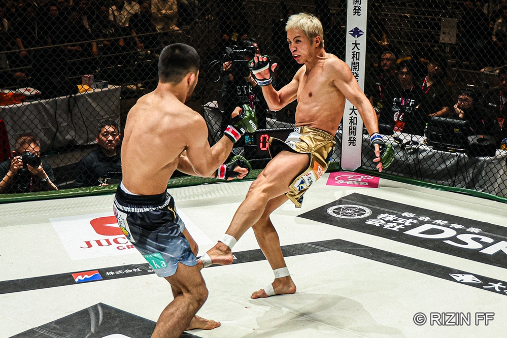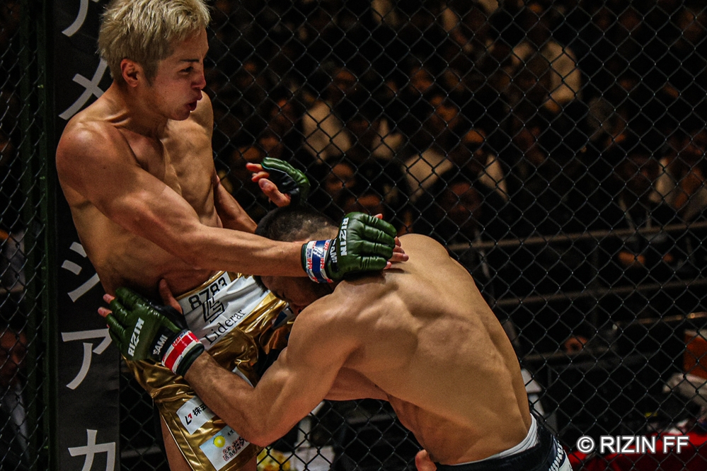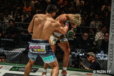 【写真】序盤こそ久保の蹴りも当たったが、一度距離を詰めてからはシェイドゥラエフの独壇場だった(C)RIZIN FF