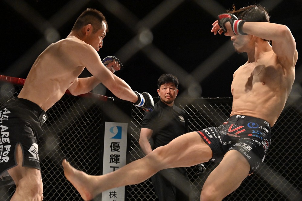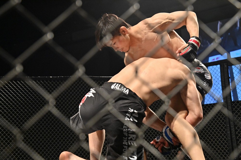 ラウンドが残り半分となり、上野が左ジャブで距離を詰める。若林の右をサイドステップでかわした上野が、若林にケージを背負わせた。左ジャブを突く上野に、若林がシングルレッグで飛び込む。