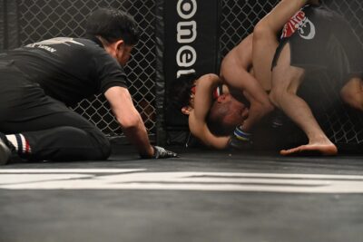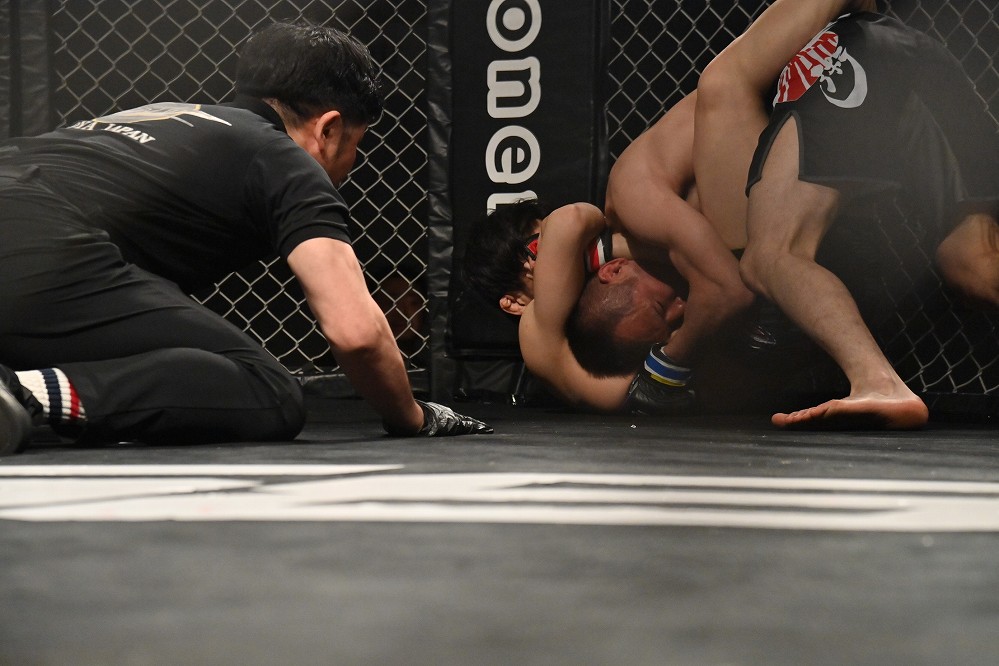 上野はカウンターのニンジャチョークで捕らえて引き込んだ。若林は腰を上げてディフェンスを試みるも、上野が絞り上げてタップを奪った。