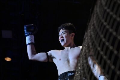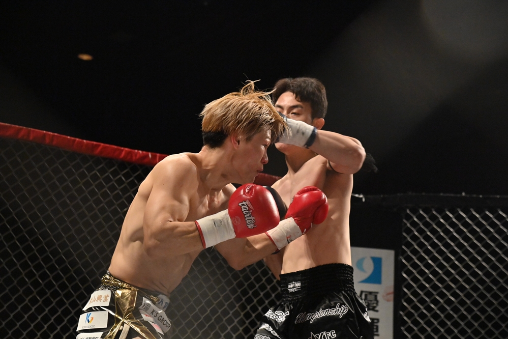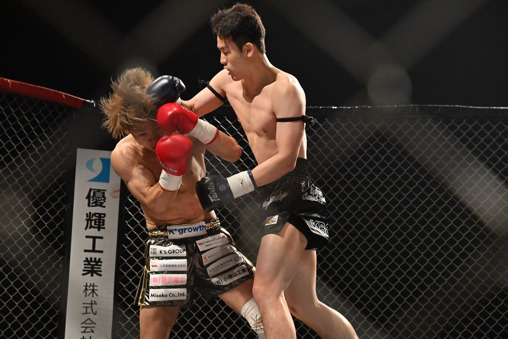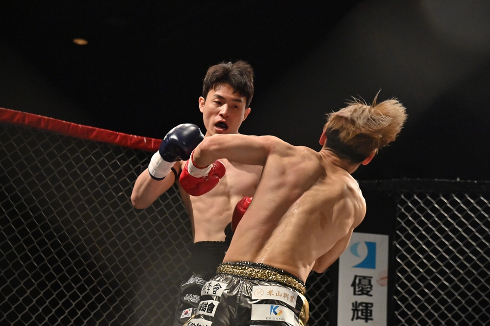 2R、ポッシブルがオーソドックスにスイッチして右ロー。これを受けたサンヘもサウスポーにスイッチする。ポッシブル=オーソドックス、サンヘ=サウスポーの喧嘩四つになり、ポッシブルがインローを蹴る。ポッシブルがサウスポーに構えを戻すと、サンヘはサウスポーのままポッシブルをケージまで下がらせる。ポッシブルも左ローを蹴るが、サンヘが右からパンチをまとめ右フックでダウンを奪う。
