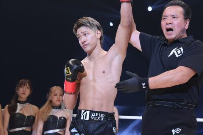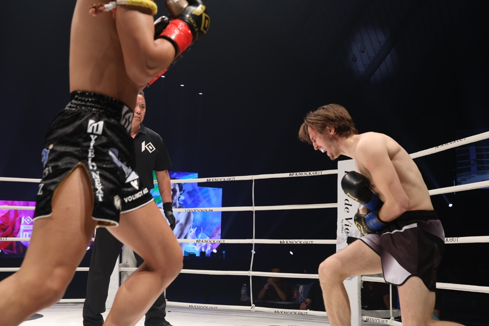 さらに龍聖がクラークをロープに詰めて左ボディとインカーフ。クラークも左ストレートを返すが、前に出る龍聖がインカーフを蹴り、パンチを上に振ってから右ボディアッパー。最後は右の三日月蹴りを突き刺して、クラークを悶絶させて鮮やかなKO勝ちを収めた。