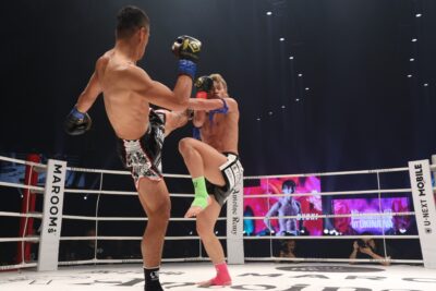 漁鬼がサウスポーのシッティチャイに対して前に出る。シッティチャイは左ストレート、右の前蹴りと左ミドル。漁鬼が前に出てくるとシッティチャイは外に回りながら左のヒザ蹴りを入れる。漁鬼は右からパンチをまとめ、シッティチャイの左ミドルに対して左フックを狙う。シッティチャイは距離を取りながら奥足ローと左ハイ、ジャブから左の前蹴りとミドル。漁鬼はインローを蹴り返す。