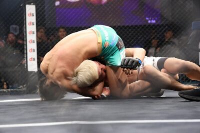友利が左右にステップを踏んで圧を掛ける。そのアゴに当真の左前蹴りがヒット。フラついた友利に当真が襲いかかるも、右テンカオを受けてバランスを崩した。マットに手を着いた当真だが、すぐに立ち上がって体勢を整える。左跳びヒザを狙おうとした友利の顔面を、当真が左フックで打ち抜く。ダウンした友利がスクランブルを狙うも当真がノーアーム・ギロチンで捕らえ、後転してセットアップ。再度引き込みながら、トップに回って絞め落とした。