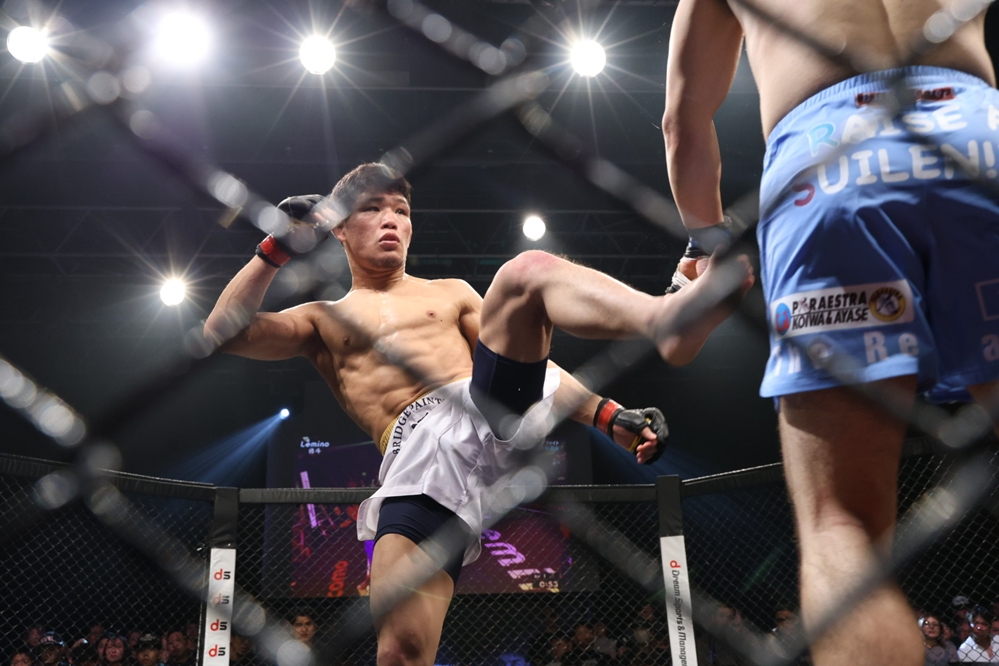 サウスポーの吉野が左ミドルを蹴る。伊集も右ミドルを蹴って、吉野が蹴り足をキャッチすると伊集がガードポジションで引き込む。吉野はインサイドガードから細かくパンチを入れ、伊集は自分の右腕をオーバーフックしてサブミッションのチャンスを狙う。吉野が伊集の左足を超えようとするが、伊集もクローズドガードに戻す。ブレイク後、伊集が前蹴りを繰り出し、吉野が蹴り足を取ってテイクダウンする。