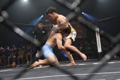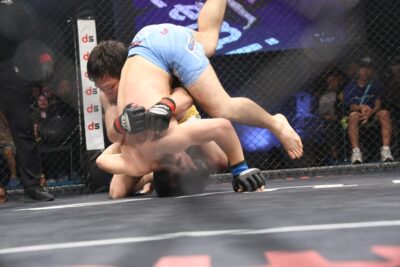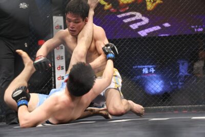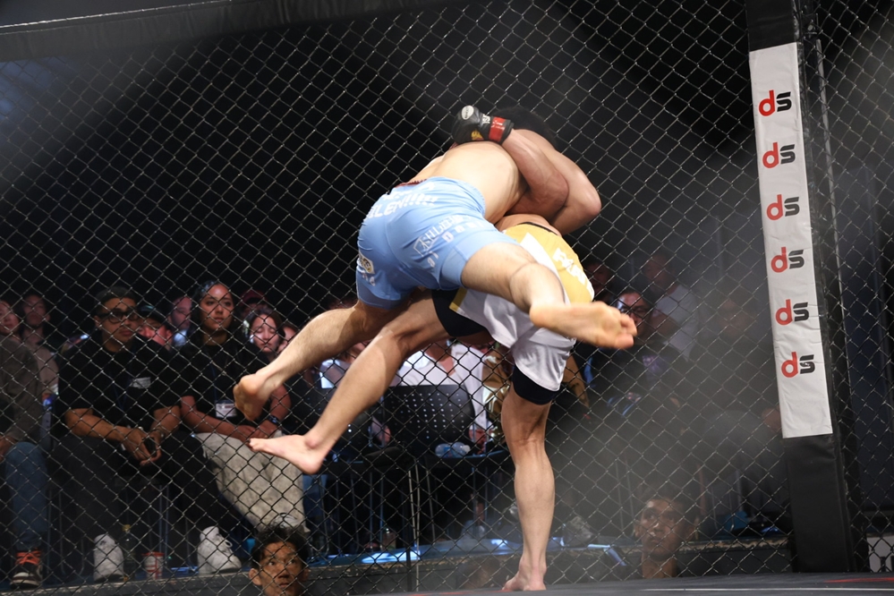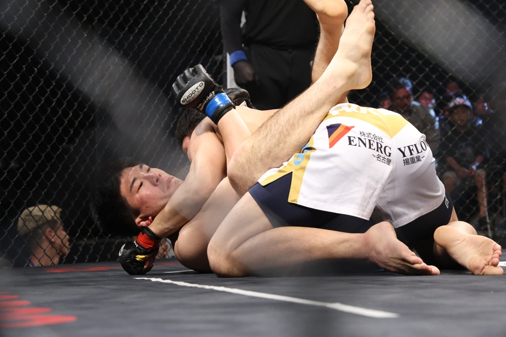 2R、すぐに伊集が前に出る。吉野が左フックを返し、そのまま組みの攻防になると、ここも吉野がグラウンドで上になる。伊集は自分の右腕をオーバーフックし、吉野は伊集の頭をケージに詰めて細かくパンチを落とそうとするがブレイクとなる。伊集は左右のミドルを蹴り、そのまま伊集がガードポジションを取る。