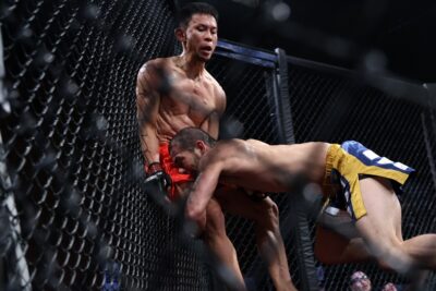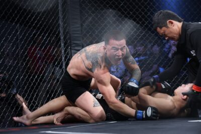 【写真】衝撃的すぎた……(C)MMAPLANET <バンタム級/5分3R> シンバートル・バットエルデネ(モンゴル) Def.1R1分20秒 by ギロチン 野瀬翔平(日本) サウスポーの野瀬が体を振って距離を詰める。…