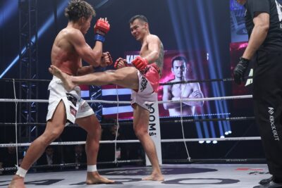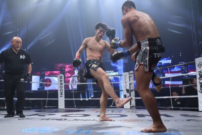 【写真】シッティチャイに左ミドルを蹴られても、必ずインロー・カーフを蹴り返し続けた海人。11月にケール、12月にシッティチャイを下し、ONEへの挑戦を明言した(C)MMAPLANET <KNOCK OUT-BLACKスーパーウェルター…