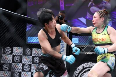 【写真】どちらに転んでもおかしくない接戦だったが、キャリア3戦目の徳本が杉本を撃破した(C)MMAPLANET <アトム級/5分3R> 徳本望愛(日本) Def.2-1:29-28.29-28.28-29. 杉本恵(日本) …